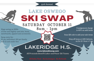 The 53rd Annual Lake Oswego Ski and Snowboard Swap and Sale, benefiting Lake Oswego and Lakeridge High School Ski Teams will take place Saturday, October 11, 2025, from 8 am to 1 pm at Lakeridge High School, 1235 Overlook Dr., Lake Oswego, OR 97034.